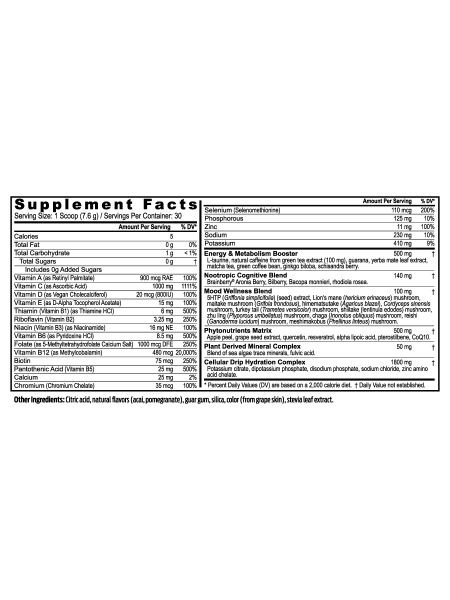 3.0 Rise™: Vitamin A, Vitamin C, Vitamin D, Vitamin E, Thiamin (Vitamin B1), Riboflavin (Vitamin B2), Niacin (Vitamin B3), Vitamin B6, Folate, Vitamin B12, Pantothenic Acid, Calcium, Chromium, Selenium, Phosphorus, Zinc, Sodium, Potassium, Energy & Metabolism Booster (L-Taurine, Natural Caffeine from Green Tea Extract, Guarana, Yerba Mate Leaf Extract, Matcha Tea, Green Coffee Bean, Ginkgo Biloba, Schisandra Berry), Nootropic Cognitive Blend (Brainberry® Aronia Berry, Bilberry, Bacopa Monnieri, Rhodiola Rosea), Mood Wellness Blend (5HTP [Griffonia Simplicifolia] Extract, Lion’s Mane Mushroom, Maitake Mushroom, Himematsutake, Cordyceps Sinensis Mushroom, Turkey Tail Mushroom, Shiitake Mushroom, Zhu Ling Mushroom, Chaga Mushroom, Reishi Mushroom, Meshimakobu Mushroom), Phytonutrients Matrix (Apple Peel, Grape Seed Extract, Quercetin, Resveratrol, Alpha Lipoic Acid, Pterostilbene, Coenzyme Q10), Plant Derived Mineral Complex (Blend of Sea Algae Trace Minerals, Fulvic Acid), Cellular Drip Hydration Complex (Potassium Citrate, Dipotassium Phosphate, Disodium Phosphate, Sodium Chloride, Zinc Amino Acid Chelate), Citric Acid, Natural Flavors (Acai, Pomegranate), Guar Gum, Silica, Color from Grape Skin, Stevia Leaf Extract.