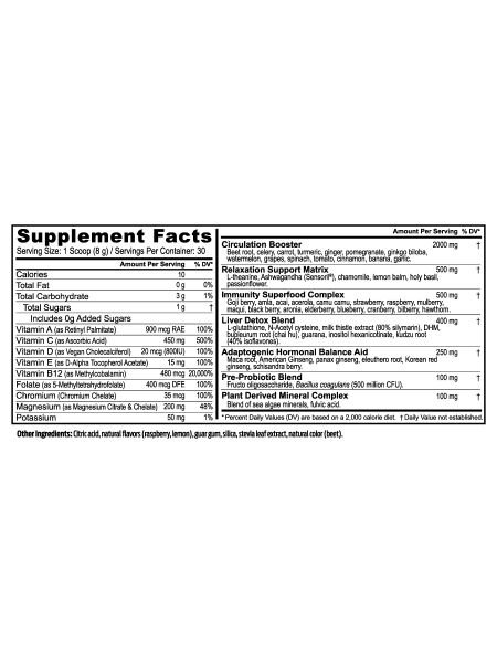 3.0 Restore™: Vitamin A, Vitamin C, Vitamin D, Vitamin E, Vitamin B12, Folate, Chromium, Magnesium, Potassium, Circulation Booster (Beet Root, Celery, Carrot, Turmeric, Ginger, Pomegranate, Ginkgo Biloba, Watermelon, Grapes, Spinach, Tomato, Cinnamon, Banana, Garlic), Relaxation Support Matrix (L-Theanine, Ashwagandha [Sensoril], Chamomile, Lemon Balm, Holy Basil, Passionflower), Immunity Superfood Complex (Goji Berry, Amla, Acai, Acerola, Camu Camu, Strawberry, Raspberry, Mulberry, Maqui, Blackberry, Aronia, Elderberry, Blueberry, Cranberry, Bilberry, Hawthorn), Liver Detox Blend (L-Glutathione, N-Acetyl Cysteine, Milk Thistle Extract, DHM, Bupleurum Root, Guarana, Inositol Hexanicotinate, Kudzu Root), Adaptogenic Hormonal Balance Aid (Maca Root, American Ginseng, Panax Ginseng, Eleuthero Root, Korean Red Ginseng, Schisandra Berry), Pre-Probiotic Blend (Fructo Oligosaccharide, Bacillus Coagulans), Plant Derived Mineral Complex (Blend of Sea Algae Minerals, Fulvic Acid), Citric Acid, Natural Flavors (Raspberry, Lemon), Guar Gum, Silica, Color from Beet, Stevia Leaf Extract.